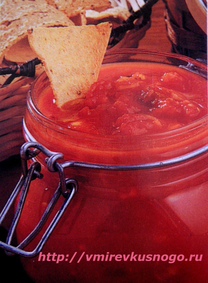 Сейчас мы будем готовить сальсу первого вида. Как-то мы пригласили гостей на обед, и забыли купить сальсу к чипсам. Обед планировали готовить на гриле во дворе, то есть до этого надо было занять гостей закуской. Выяснилось, что нет сальсы в тот момент, когда до ближайшего открытого магазина было слишком далеко ехать, поэтому пришлось выходить из ситуации другим способом. Благо был сезон томатов, поэтому я решила приготовить сальсу сама. Это был первый и очень удачный опыт приготовления сальзы. Я не раз делилась этим рецептом с моими гостями, теперь делюсь с вами: