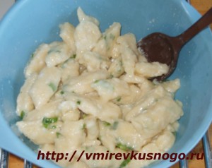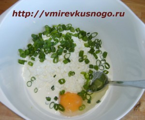Ставим кастрюлю на огонь для закипания. В емкость, в которой можно замесить тесто, высыпаем творог, разбиваем сюда же яйцо, порезанные перья лука, муку и соль.