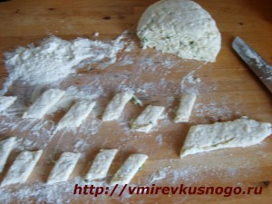 Тщательно все перемешиваем. При необходимости добавляем еще муку. Ее количество зависит от того, насколько сухой или мокрый творог вы будете использовать. Тесто не должно быть сильно тугим, потому что из-за муки в готовых ленивых варениках не будет чувствоваться вкус творога, но и не слишком мокрым. Тесто должно держаться вместе. Отрезаем небольшой кусочек, раскатываем его в колбаску, а затем немного приминаем ее по всей длине. Я беру не острый нож и под углом режу эту ленту из теста на кусочки.