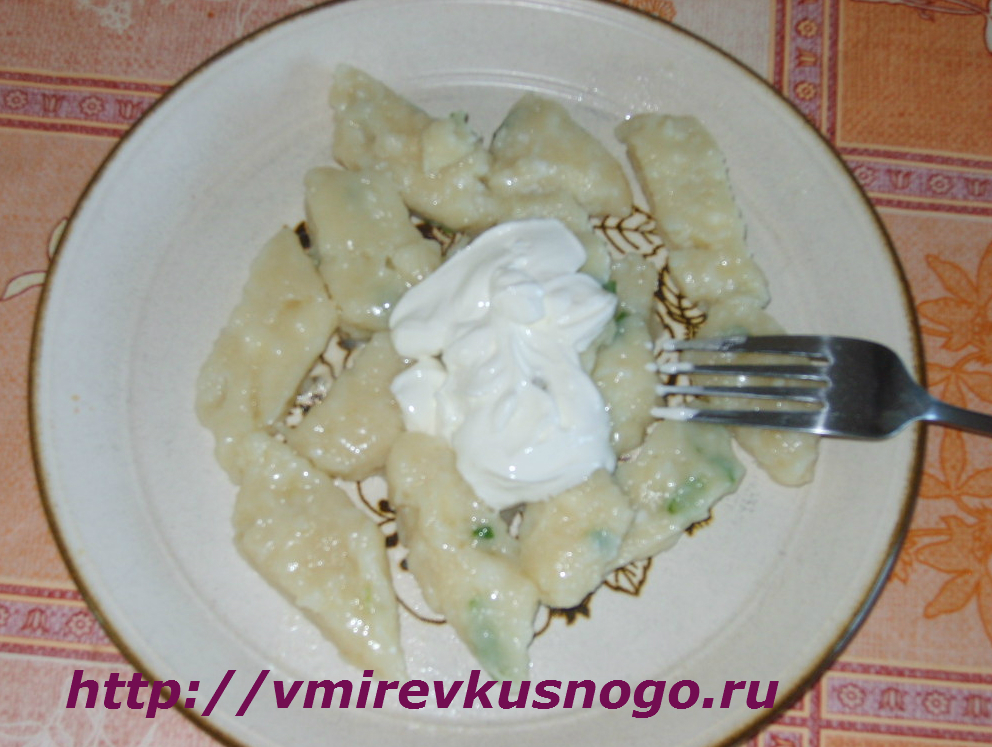 Если из рецепта исключить зеленый лук, а на готовые вареники со сметаной посыпать сахар, то тоже получится очень вкусно.