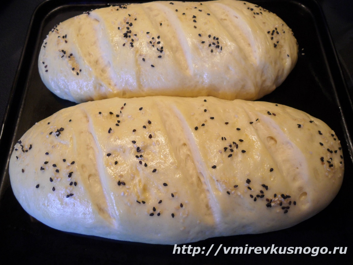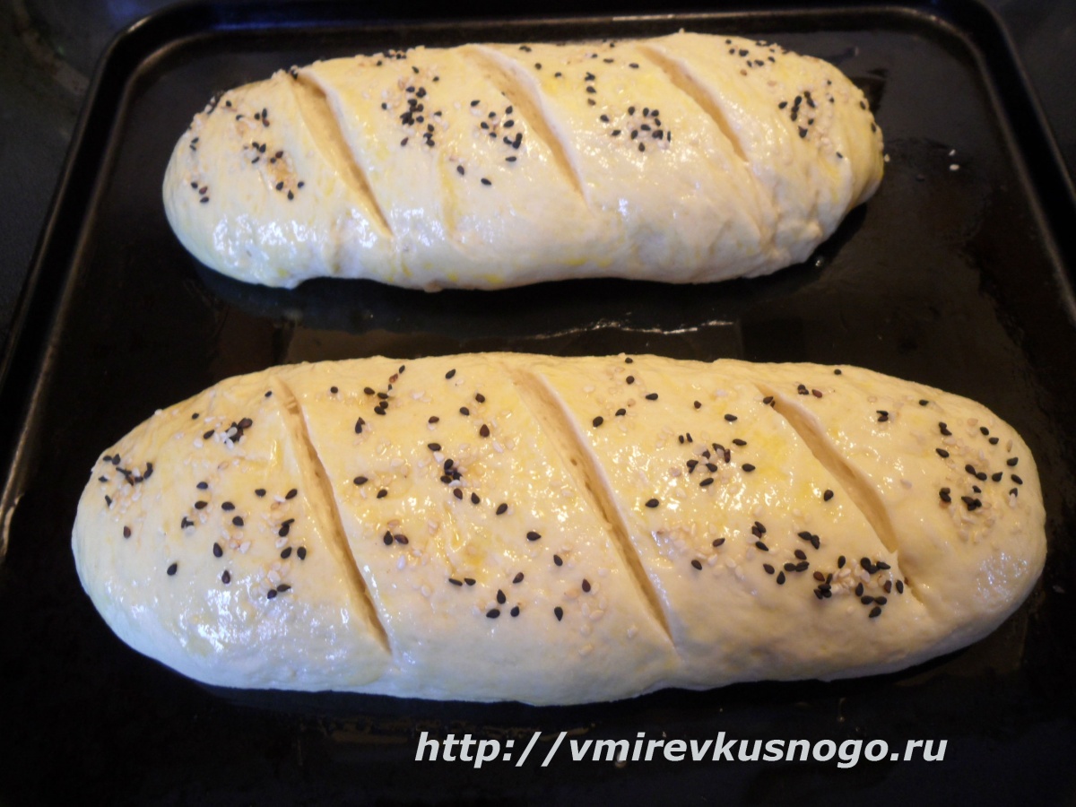 Собираем тесто в шар, накрываем и оставляем для подъема на 40-50 минут. Выкладываем тесто на разделочную доску, немного обминаем и формируем продолговатые батоны (у меня получается 2 шт.). Накрываем и оставляем на расстойку еще на 30 минут. Смазываю поверхность оставшимся яйцом и посыпаю кунжутом.